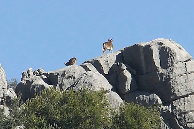 Thanks to him we saw dozens of griffon vultures, a territorial Bonelli's eagle fiercely challenging soaring vultures who might like to claim her spring nest, many other birds, and ibex. We drove up a simple dirt track superseding an old drovers' road past ancient oak trees pruned by those drovers for abundant acorns to fatten pigs being brought to market, and through rough and stark limestone hills. We ate a hearty lunch at a local village restaurant where he knew the owners and patrons well enough, with fluent enough Spanish, for some friendly ribbing and a warm welcome.